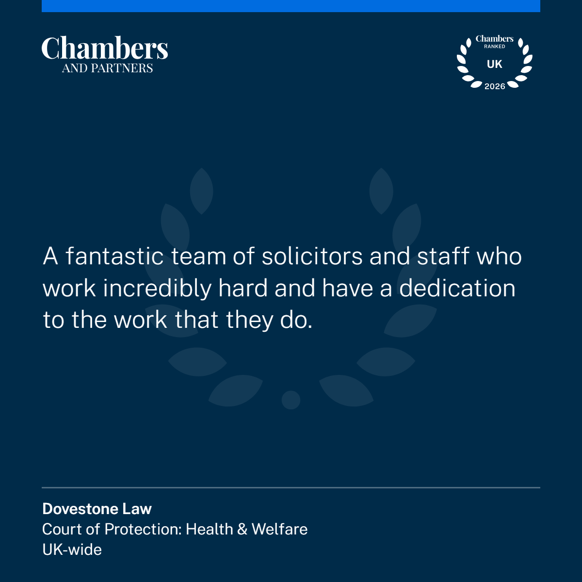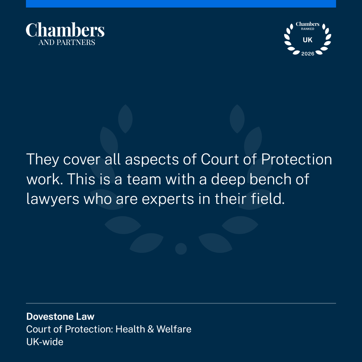 Prospective clients and those making referrals on their behalf can choose Dovestone Law in the knowledge that members of our team have proven knowledge of Court of Protection practice and procedure, an ability to consider the often conflicting needs of a vulnerable client and procedures in a practical and sensitive manner. We understand the particular sensitivities and vulnerabilities of clients, the scope for conflicts of interest within proceedings and the effect of the decisions in health and welfare matters. We welcome referrals from Independent Mental Capacity Advocates (IMCA’s) and paid relevant persons representative (RPR’s).